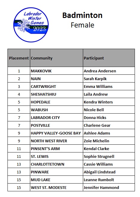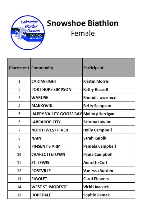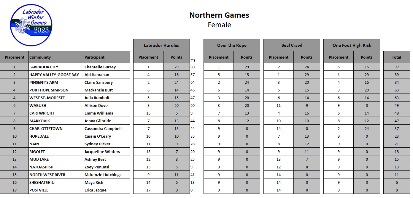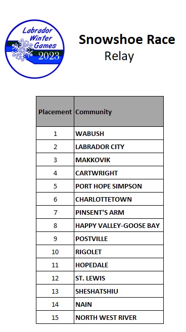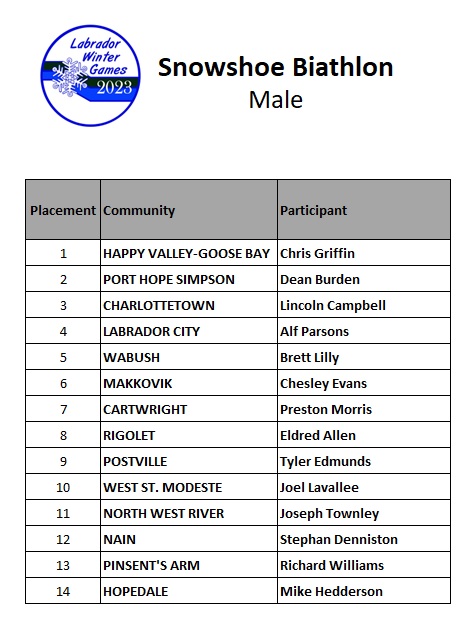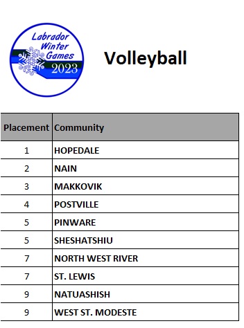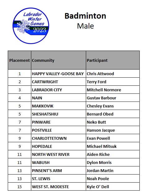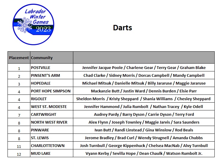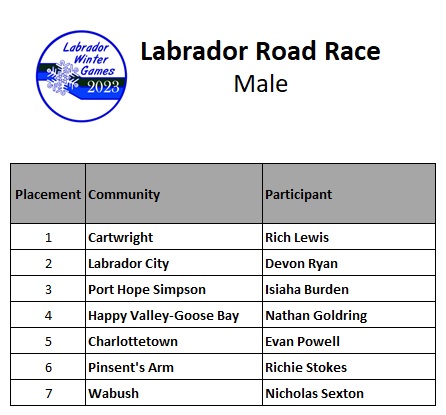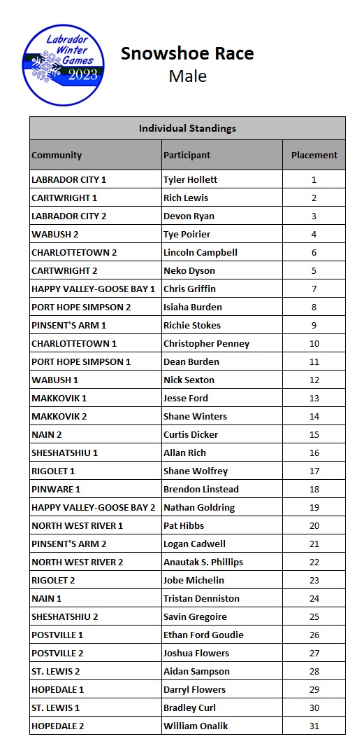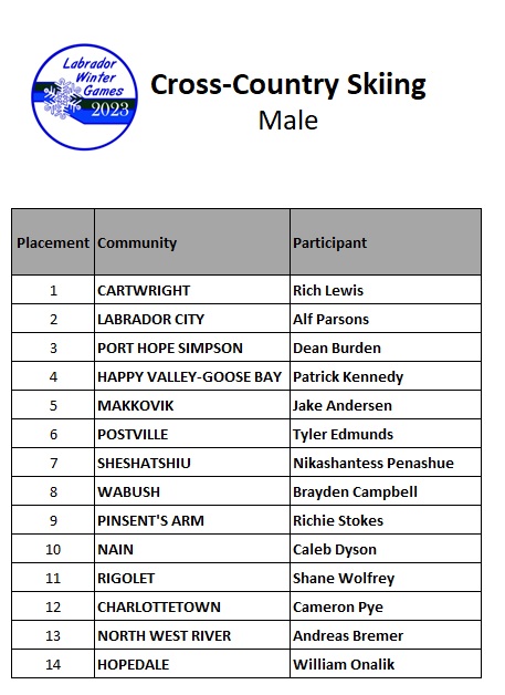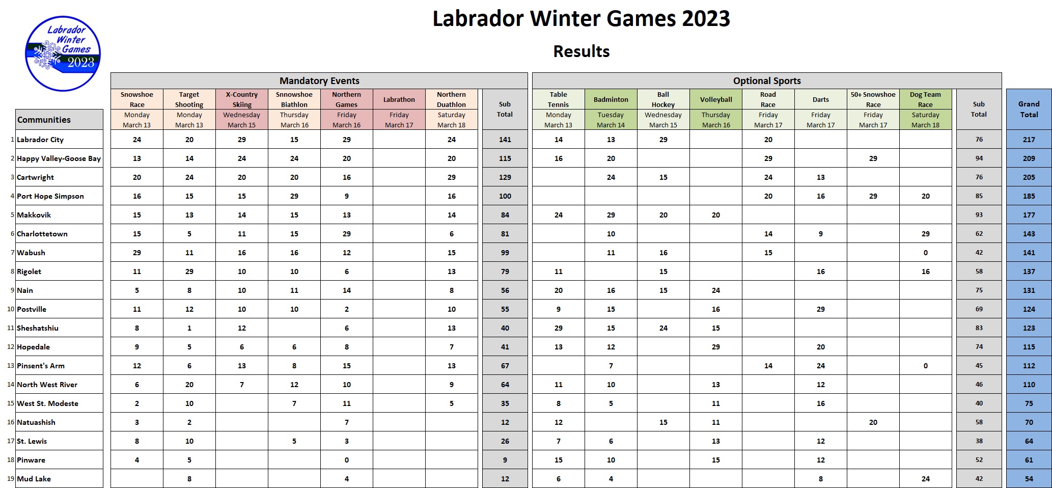 Results for the 2026 Labrador Winter Games will be available here when the Games commence in March 2026. Meanwhile, the final results from the 2023 Labrador Winter Games are shown below.